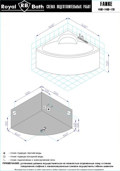 Акриловая ванна Royal Bath - идеальный выбор для создания атмосферы релакса и умиротворения, как в просторной в ванной комнате, так и в комнатном санузле. Основным преимуществом ванны из акрила считается её малый вес, высокая гигиеничность данного материала и низкая теплопроводность, долго сохраняющая комфортную температуру воды.Форма ванны Royal Bath замечательно подойдет к любому интерьерному решению, в различных вариантах размещения внутри ванной комнаты. Пристенная установка - это наиболее традиционный вид установки, а при использовании декоративного экрана пространство под ванной можно использовать как место хранения моющих средств. Оптимальная глубина позволяет принимать ванну с максимальным комфортом и полным расслаблением. Ванна Royal Bath выполнена со строгим соблюдением всех значительных элементов современного стиля.Благодаря тому, что родина бренда Royal Bath - Россия, можно смело быть уверенным в непревзойденном качестве и долговечности ванны, так как производство полностью соответствует стандартам качества. Акриловая ванна Royal Bath - это незаменимый, основной элемент любой ванной комнаты, без которого невозможно обойтись, ни в многоквартирном доме, ни в загородном коттедже.Комплектация гидромассажной ванны:- акриловая ванна Fanke 140x140x65;- каркас сварной к ванне Fanke 140;- панель фронтальная к ванне Fanke 140;- гидромассажная система на 4 форсунки;- спинной массаж на 6 форсунок;- слив-перелив для ванны полуавтомат 60 см.Ожидаемый срок поставки 7 дней.Обратите внимание: данная позиция поставляется под заказ! Товар поставляется по 100%-ной предоплате.Данный товар является заказным и имеет индивидуально-определенные свойства.
