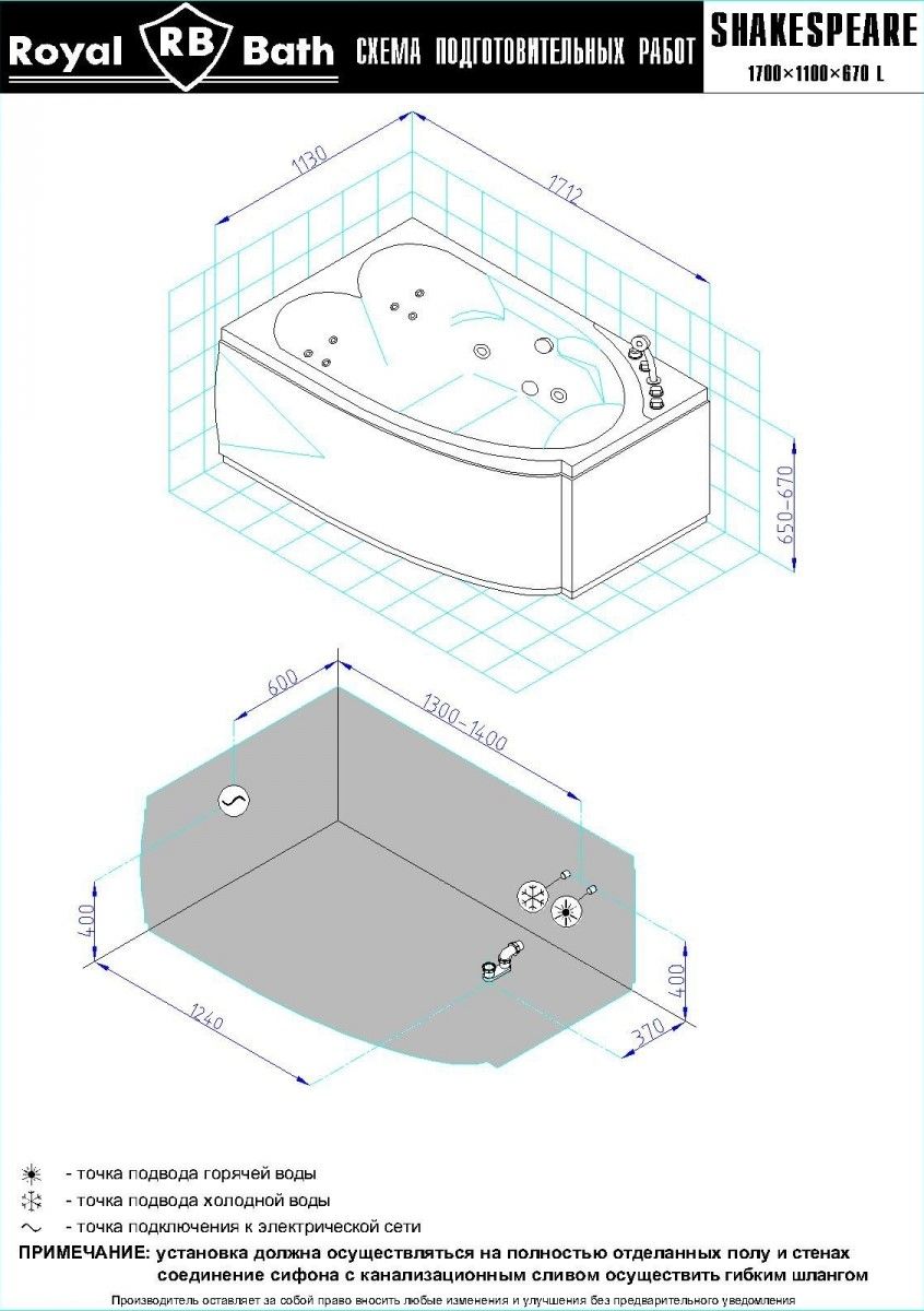 Акриловая ванна Royal Bath - идеальный выбор для создания атмосферы релакса и умиротворения, как в просторной в ванной комнате, так и в комнатном санузле. Основным преимуществом ванны из акрила считается её малый вес, высокая гигиеничность данного материала и низкая теплопроводность, долго сохраняющая комфортную температуру воды.Форма ванны Royal Bath замечательно подойдет к любому интерьерному решению, в различных вариантах размещения внутри ванной комнаты. Пристенная установка - это наиболее традиционный вид установки, а при использовании декоративного экрана пространство под ванной можно использовать как место хранения моющих средств. Оптимальная глубина позволяет принимать ванну с максимальным комфортом и полным расслаблением. Ванна Royal Bath выполнена со строгим соблюдением всех значительных элементов современного стиля.Благодаря тому, что родина бренда Royal Bath - Россия, можно смело быть уверенным в непревзойденном качестве и долговечности ванны, так как производство полностью соответствует стандартам качества. Акриловая ванна Royal Bath - это незаменимый, основной элемент любой ванной комнаты, без которого невозможно обойтись, ни в многоквартирном доме, ни в загородном коттедже.Комплектация гидромассажной ванны:- акриловая ванна Shakespeare 170x110x67 с каркасом;- панель фронтальная к ванне Shakespeare 170;- гидромассажная система на 6 форсунок;- спинной массаж на 4 форсунки;- смеситель на борт ванны RB Hardon 611;- слив-перелив для ванны полуавтомат 60 см.Ожидаемый срок поставки 7 дней.Обратите внимание: данная позиция поставляется под заказ! Товар поставляется по 100%-ной предоплате.Данный товар является заказным и имеет индивидуально-определенные свойства.