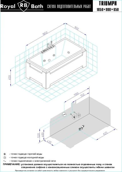 Акриловая ванна Royal Bath - идеальный выбор для создания атмосферы релакса и умиротворения, как в просторной в ванной комнате, так и в комнатном санузле. Основным преимуществом ванны из акрила считается её малый вес, высокая гигиеничность данного материала и низкая теплопроводность, долго сохраняющая комфортную температуру воды.Форма ванны Royal Bath замечательно подойдет к любому интерьерному решению, в различных вариантах размещения внутри ванной комнаты. Пристенная установка - это наиболее традиционный вид установки, а при использовании декоративного экрана пространство под ванной можно использовать как место хранения моющих средств. Оптимальная глубина позволяет принимать ванну с максимальным комфортом и полным расслаблением. Ванна Royal Bath выполнена со строгим соблюдением всех значительных элементов современного стиля.Благодаря тому, что родина бренда Royal Bath - Россия, можно смело быть уверенным в непревзойденном качестве и долговечности ванны, так как производство полностью соответствует стандартам качества. Акриловая ванна Royal Bath - это незаменимый, основной элемент любой ванной комнаты, без которого невозможно обойтись, ни в многоквартирном доме, ни в загородном коттедже.Комплектация гидромассажной ванны:- акриловая ванна Triumph 185х87х65 в сборе;- гидромассажная система на 6 форсунок;- аэромассаж с хромотерапией на 8 форсунок;- cмеситель на борт ванны RB Triumph 501;- слив-перелив для ванны полуавтомат 80 см.Ожидаемый срок поставки 7 дней.Обратите внимание: данная позиция поставляется под заказ! Товар поставляется по 100%-ной предоплате.Данный товар является заказным и имеет индивидуально-определенные свойства.