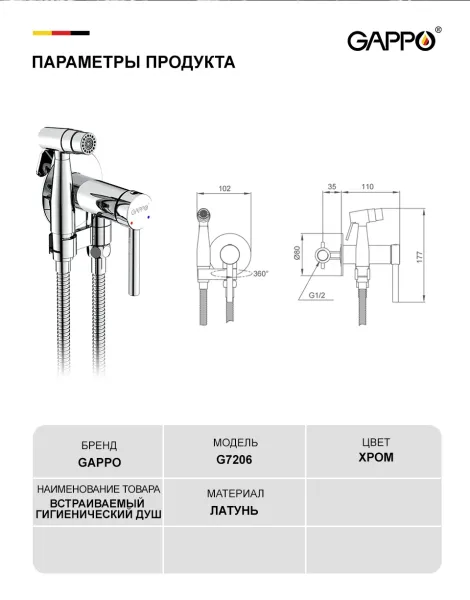 Выбирая гигиенический душ скрытого монтажа Gappo G7206 хром, вы получаете современное, функциональное и надежное решение для вашей ванной комнаты.