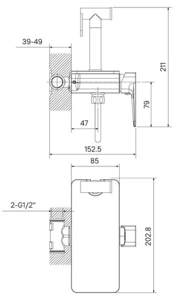Гигиеническая лейка из прочной латуни, внутренняя часть и душевой шланг в оплётке из нержавеющей стали (1,2 м) в комплекте.