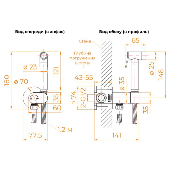 Смеситель на одно монтажное отверстие на два входа, инсталляция (встраиваемый) в стену. Керамический прогрессивный картридж. Корпус смесителя — латунь.Смеситель круглой формы с гигиенической лейкой со средней струей. Струя из гигиенического душа выходит плотная, упругая и направленная. Она может быть как мягкой рассеянной, так и интенсивной, в зависимости от выбранного напора воды. Её температура легко регулируется от прохладной до комфортно тёплой. Вода подаётся равномерно, без пульсаций, обеспечивая точное и аккуратное очищение. Форма струи в этой модели узконаправленная, что делает её удобной для гигиенических процедур.Гибкий шланг «RGW — Стильные душевые» не дешевое изделие. Он состоит из наружной металлической оплетки и внутренней водяной трубки из силикона. Внутренняя силиконовая трубка более долговечна, лучше выдерживает перепады давления и гидравлические удары, не ломается со временем, как резина, и не способствует появлению грибка и плесени.Шланг длиной 120 мм имеет защиту от заломов и перекручивания.Пластиковая монтажная коробка.