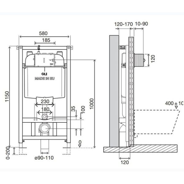 Инсталляционная система OLI 74 с пневматической системой смыва, мет. крепления. Размер (0580/1150/0120). Самая популярная инсталляция в Европе.