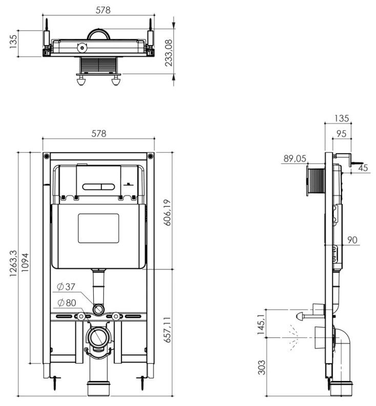Смывной бачок с маленьким ревизионным окошкомМонтажная высота 1094 - 1263 ммДля монтажа перед стеной или стеной перегородкойСамонесущая стальная рама с порошковым напылениемПодготовлена для облицовкиФиксированные подключенияДля одиночного или рядного монтажаБыстрая регулировка по высотеКрепежный материал2 держателя для унитазаКрепление для керамикиРасстояние между болтами 180/230 ммВыходной патрубок для унитаза 80 ммРегулировка глубины монтажаВпускной и смывной гарнитурыСмывной бачок 9 лБесшовный бачок, бесшумный сливЗаводская настройка 6 л и 3 лПневматический смывной клапан с двумя режимами слива: 2-х объёмный, непрерывныйПодключение воды сверхуАрматурная группа IВ соответствии с DINС изоляцией от конденсационной влагиПодключение воды DN 15С принадлежностями для монтажа перед стенойС накладной прямоугольной панелью в цвете черный матовый