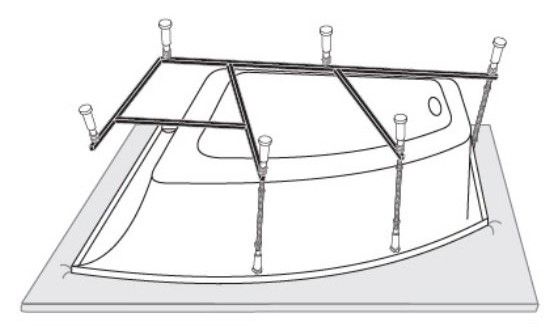 Усиленный цельносварной стальной каркас для ванны изготовлен из квадратного металлического профиля 2х2 см и окрашен темно-бронзовой молотковой краской. Каркас имеет 8 ножек и 4 опоры в борт ванны снизу. Предназначен для использования во влажных помещениях.