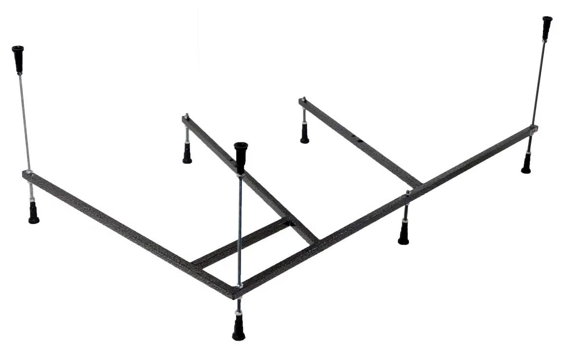 Усиленный цельносварной стальной каркас для ванны изготовлен из квадратного металлического профиля 2х2 см и окрашен темно-бронзовой молотковой краской. Каркас имеет 8 ножек и 4 опоры в борт ванны снизу. Предназначен для использования во влажных помещениях.
