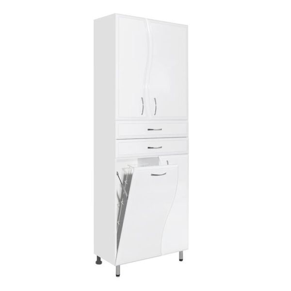 Колонна Style Line Волна ЛС-000010050 белый матовыйШкаф-пенал Style Line Волна 70 ЛС-000010050 - весьма удобный и функциональный шкаф, позволяющий бережно и аккуратно хранить массу различных вещей, и принадлежностей.Конструкция изделия в верхней части имеет две распашные дверцы с полкой, в центре установлены два выдвижных ящика, а снизу - справа распашная дверца с полкой, слева откидной фасад с бельевой корзиной.Визуально шкаф выполнен в базовом белом цвете, из качественного влагостойкого МДФ, покрытого пленкой ПВХ. В силуэте фасадов прослеживается плавная волнистая линия, оправдывающая выбранное название для коллекции.