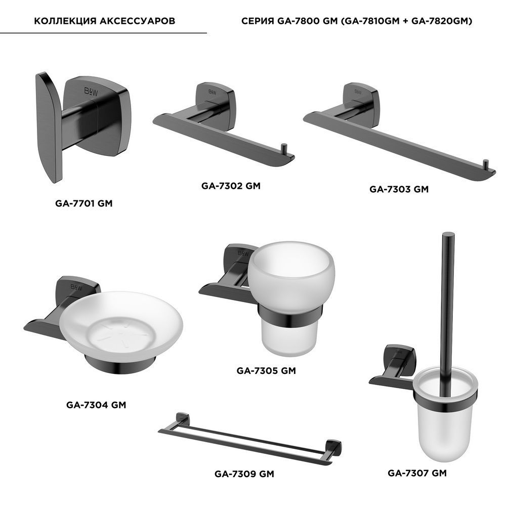 Комплект аксессуаров для ванной комнаты Black and White 7820GM Темно-серыйНеповторимые изгибы, плавные линии, особый дизайн, который невероятно украсить ванную комнату и наполнит атмосферу уникальностью. Коллекция выполнена только в цветовом решении GUN Metal. Что позволяет еще больше сделать акцент на правильной геометрии каждого сантиметра. Для придания большей загадочности использовано матовое стекло в держателе для зубных щеток, мыла, ершика.Такой дизайн подойдет, если Вы любите простоту и благородную изысканность. Коллекция выполнена из надежных материалов: латунь и закаленное стекло, именно это позволяет не беспокоиться о надежности и увеличенном сроке службы каждого изделия. Соберите полную коллекцию из двух наборов, чтобы не думать о том, чего же еще не хватает.