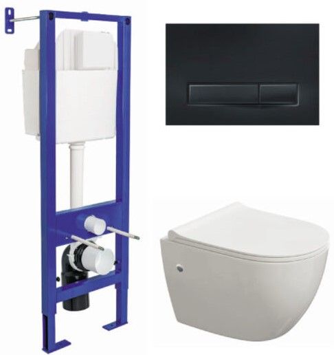 Инсталляция с кнопкой:Узкая рама шириной 41 см.Металлический каркас, окрашенный антикоррозийной эмалью.Расчетная нагрузка 400кг. Объём резервуара воды 10 л с тепло- и шумоизоляцией.Подвод воды внутрь резервуара (G1/2 наружная).Объем смыва 3/6 литра с возможностью регулировки.Управление механическое, две кнопки.Межосевое расстояние под шпильки для подвеса унитаза 18 и 23 см. Унитаз:Ободковый унитаз OKUSДушевой смывКомпактная модель 48смСкрытый крепежСиденье дюропласт Toma Slim SO:микролифт, быстросъем