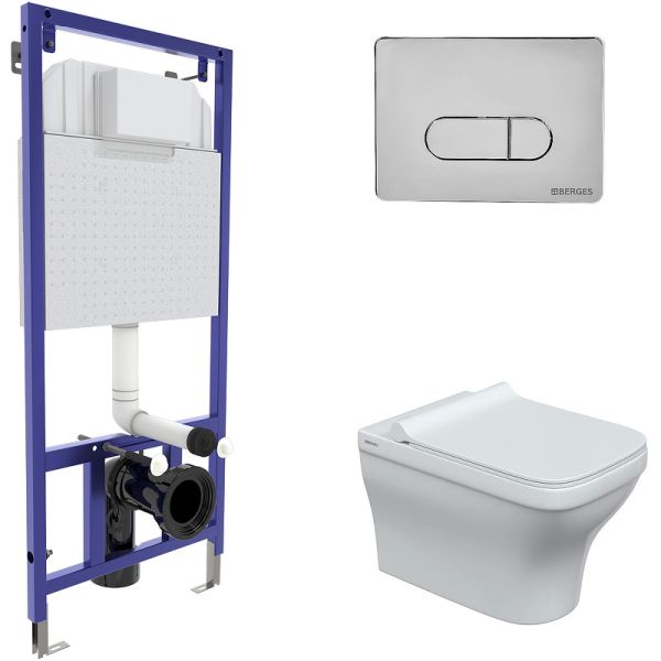 Комплект Berges 4в1 042450: инсталляция NOVUM кнопка D3 хром глянец унитаз Strati Rimless сиденье Strati Slim SO