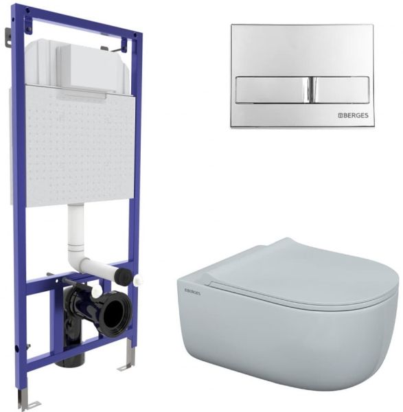 Полный комплект BERGES для монтажа подвесного унитаза. 1. Инсталляция NOVUM525Толщина бачка 80 мм.Межосевое расстояние под крепежные шпильки унитаза 18 и 23 см.Резервуар воды объемом 10 литров с тепло-шумоизоляцией.Уровень шума при давлении 3 бар не превышает 13 дБ.Подвод воды сверху (G1/2 наружная).Объем смыва 3/6 литра с возможностью регулировки. Металлический каркас, окрашенный антикоррозийной эмалью, расчетная нагрузка до 400 кг.Ножки регулировки высоты из оцинкованной стали. Возможность установки в угол. 2. кнопка L3 хром глянецABS-пластик 3. унитаз EGO XL Rimless,безободковая система смыва, антибактериальное покрытиеэкономия воды, скрытый крепеж 4. сиденье дюропласт Toma Slim SOмикролифт, быстросъем. Все крепежи для установки в комплекте