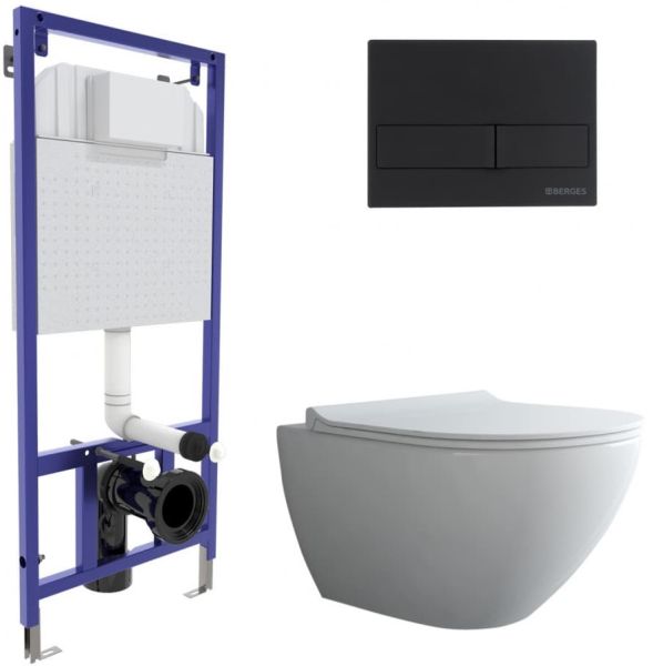 Комплект Berges 4в1 043246: инсталляция NOVUM525 кнопка L5 SoftTouch чёрная унитаз Puma XL Rimless сиденье Toma Slim SO