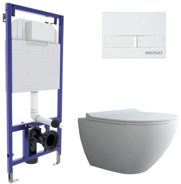 Полный комплект BERGES для монтажа подвесного унитаза. 1. Инсталляция NOVUM525Толщина бачка 80 мм.Межосевое расстояние под крепежные шпильки унитаза 18 и 23 см.Резервуар воды объемом 10 литров с тепло-шумоизоляцией.Уровень шума при давлении 3 бар не превышает 13 дБ.Подвод воды сверху (G1/2 наружная).Объем смыва 3/6 литра с возможностью регулировки. Металлический каркас, окрашенный антикоррозийной эмалью, расчетная нагрузка до 400 кг.Ножки регулировки высоты из оцинкованной стали. Возможность установки в угол. 2. кнопка L1 белаяABS-пластик 3. унитаз PUMA XL Rimless,безободковая система смыва, антибактериальное покрытиеэкономия воды, скрытый крепеж 4. сиденье дюропласт Toma Slim SOмикролифт, быстросъем Все крепежи для установки в комплекте