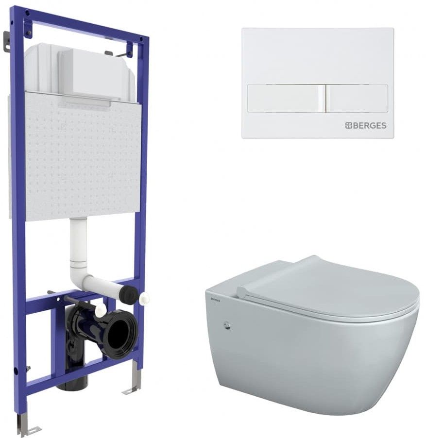 Полный комплект BERGES для монтажа подвесного унитаза. 1. Инсталляция NOVUM525Толщина бачка 80 мм.Межосевое расстояние под крепежные шпильки унитаза 18 и 23 см.Резервуар воды объемом 10 литров с тепло-шумоизоляцией.Уровень шума при давлении 3 бар не превышает 13 дБ.Подвод воды сверху (G1/2 наружная).Объем смыва 3/6 литра с возможностью регулировки. Металлический каркас, окрашенный антикоррозийной эмалью, расчетная нагрузка до 400 кг.Ножки регулировки высоты из оцинкованной стали. Возможность установки в угол. 2. кнопка L1 белаяABS-пластик 3. унитаз MASCON Rimless,безободковая система смыва, антибактериальное покрытиеэкономия воды, скрытый крепеж 4. сиденье дюропласт Toma Slim SOмикролифт, быстросъем Все крепежи для установки в комплекте