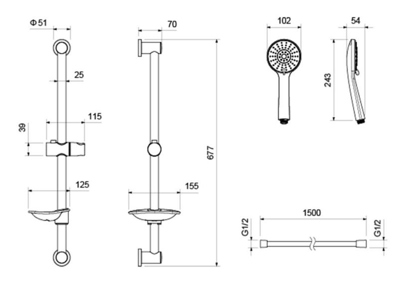 • Душевой гарнитур: душевая стойка с мыльницей, лейка, шланг