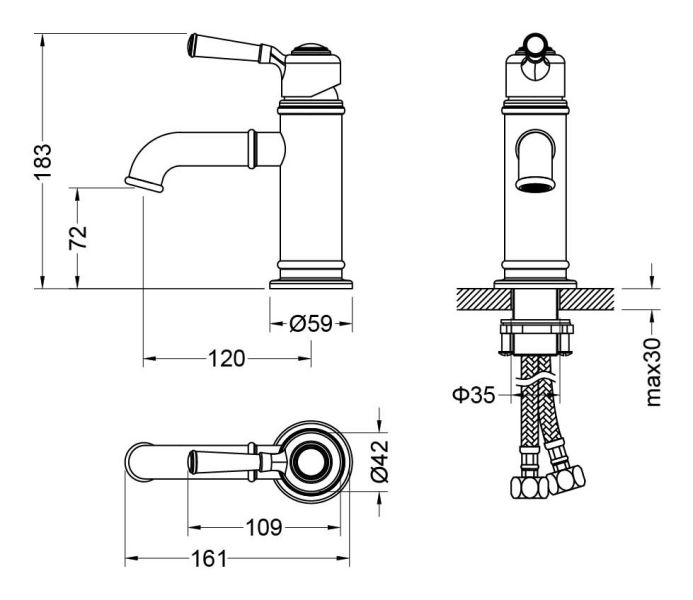 В комплекте: смеситель; гибкая подводка 60см; монтажный комплект
