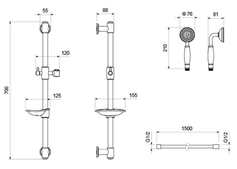 • Душевой гарнитур: душевая стойка с мыльницей, лейка, шланг