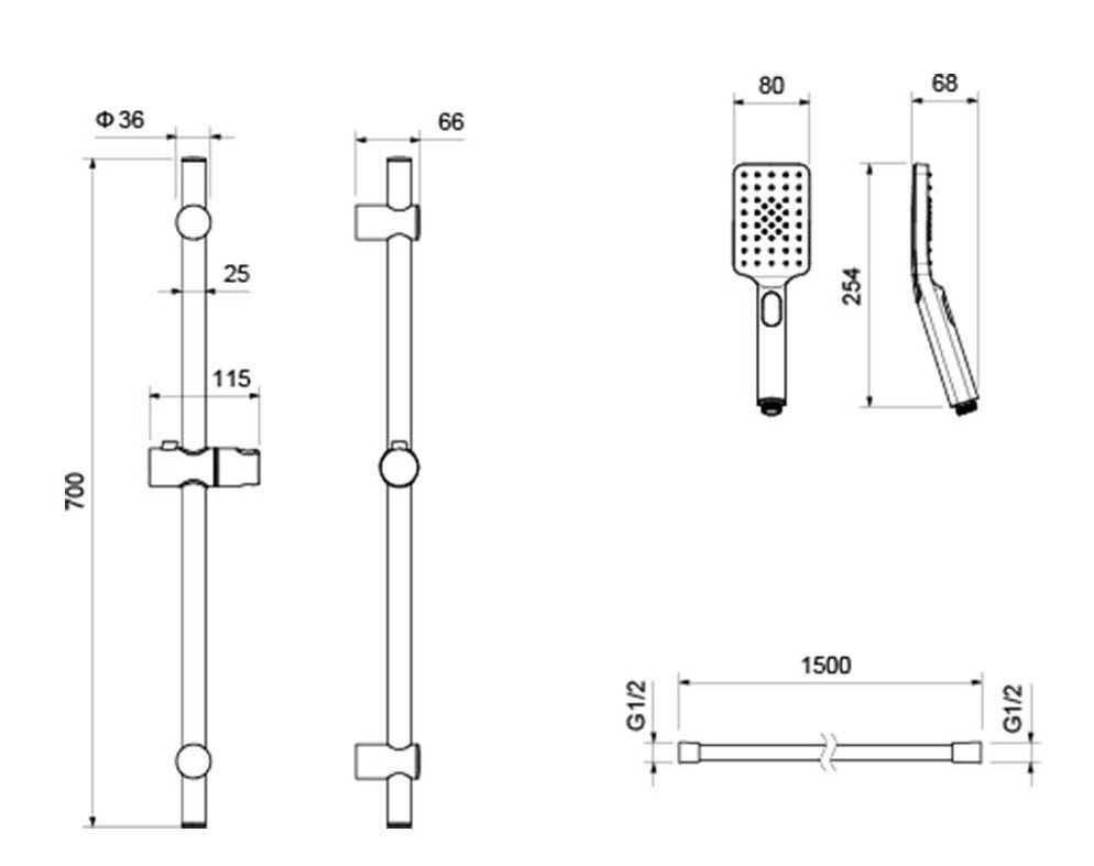 • Душевой гарнитур: душевая стойка, лейка, шланг