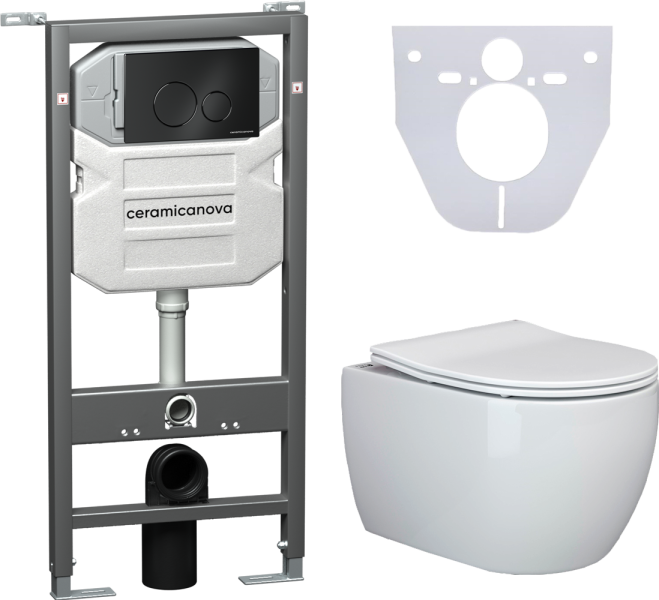 Сет 4 в 1: CN3001_1001B_1000Подвесной унитаз PLAY Rimless арт. CN3001Шумоизоляционная панель для инсталляции арт. CN1000Система инсталляции для унитазов CERAMICANOVA Envision с кнопкой смыва Round цвет чёрный матовый и креплениями, арт. CN1001B