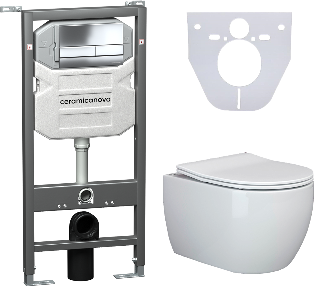 Сет 4 в 1: CN3001_1002CH_1000Подвесной унитаз PLAY Rimless арт. CN3001Шумоизоляционная панель для инсталляции арт. CN1000Система инсталляции для унитазов CERAMICANOVA Envision с кнопкой смыва Flat цвет хром, креплениями, арт. CN1002CHПодвесной безободковый унитаз Ceramica Nova Play Rimless, крышка микролифт, CN3001