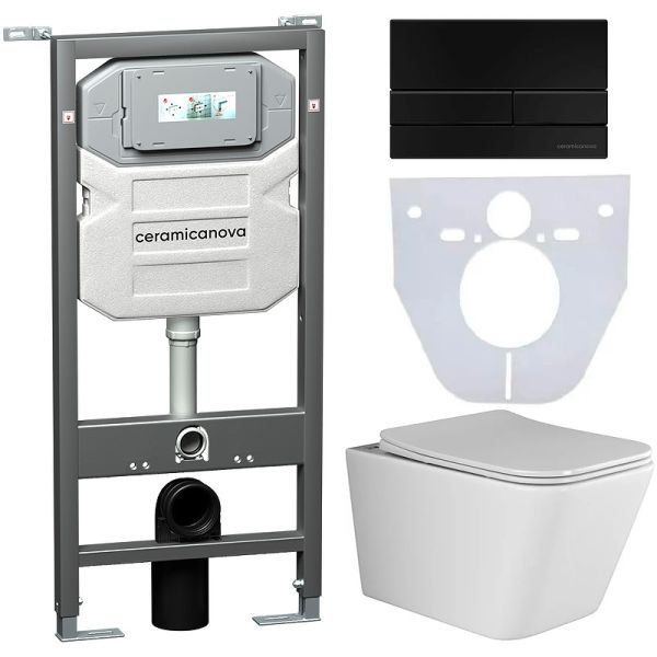 Сет 4 в 1: CN3007_1002B_1000Подвесной унитаз Metric Rimless арт. CN3007Шумоизоляционная панель для инсталляции арт. CN1000Система инсталляции для унитазов CERAMICANOVA Envision с кнопкой смыва Flat цвет черный матовый, креплениями, арт. CN1002BПодвесной безободковый унитаз Ceramica Nova Metric Rimless, крышка микролифт, CN3007