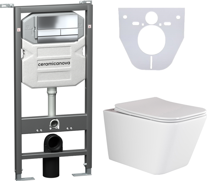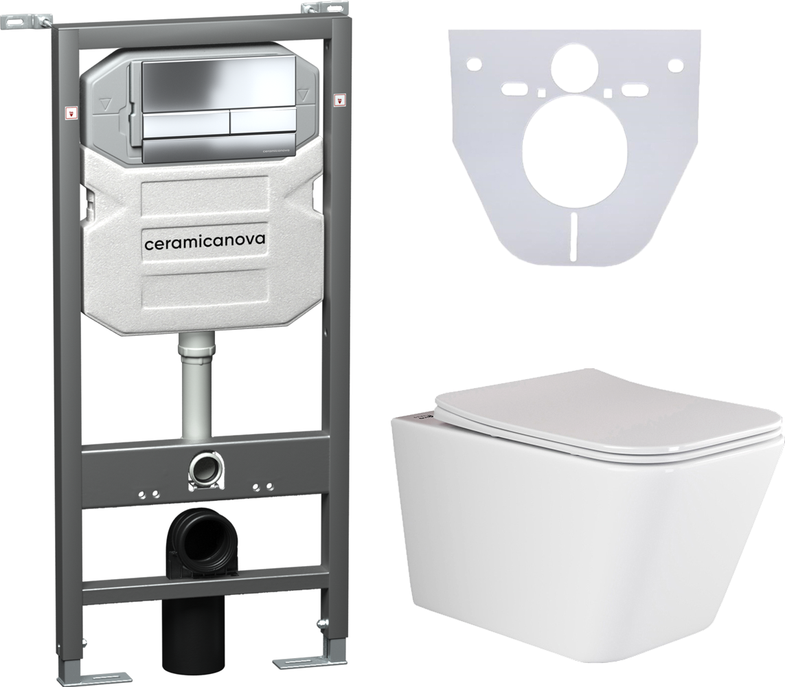 Сет 4 в 1: CN3007_1002CH_1000Подвесной унитаз Metric Rimless арт. CN3007Шумоизоляционная панель для инсталляции арт. CN1000Система инсталляции для унитазов CERAMICANOVA Envision с кнопкой смыва Flat цвет хром, креплениями, арт. CN1002CH Подвесной безободковый унитаз Ceramica Nova Metric Rimless, крышка микролифт, CN3007