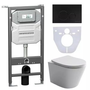 Сет 4 в 1: CN6000_1001B_1000Подвесной унитаз Balearica Rimless арт. CN6000Шумоизоляционная панель для инсталляции арт. CN1000Система инсталляции для унитазов CERAMICANOVA Envision с кнопкой смыва Round цвет чёрный матовый и креплениями, арт. CN1001B Подвесной унитаз Balearica Rimless CN6000, глубокий смыв, с крепежом для полностью скрытого монтажа, ультра тонким с сидением и крышкой с функцией плавного закрытия, дюропластШумоизоляционная панель для инсталляции CN1000