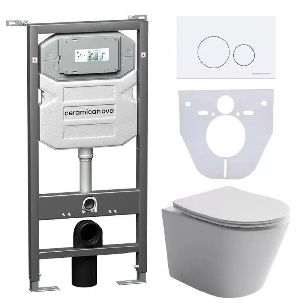 Сет 4 в 1: CN6000_1001W_1000Подвесной унитаз Balearica Rimless арт. CN6000Шумоизоляционная панель для инсталляции арт. CN1000Система инсталляции для унитазов CERAMICANOVA Envision с кнопкой смыва Round цвет белый и креплениями арт. CN1001W Подвесной унитаз Balearica Rimless CN6000, глубокий смыв, с крепежом для полностью скрытого монтажа, ультра тонким с сидением и крышкой с функцией плавного закрытия, дюропласт
