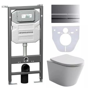 Сет 4 в 1: CN6000_1002M_1000Подвесной унитаз Balearica Rimless арт. CN6000Шумоизоляционная панель для инсталляции арт. CN1000Система инсталляции для унитазов CERAMICANOVA Envision с кнопкой смыва Flat цвет хром матовый, креплениями, арт. CN1002M Подвесной унитаз Balearica Rimless CN6000, глубокий смыв, с крепежом для полностью скрытого монтажа, ультра тонким с сидением и крышкой с функцией плавного закрытия, дюропластШумоизоляционная панель для инсталляции CN1000