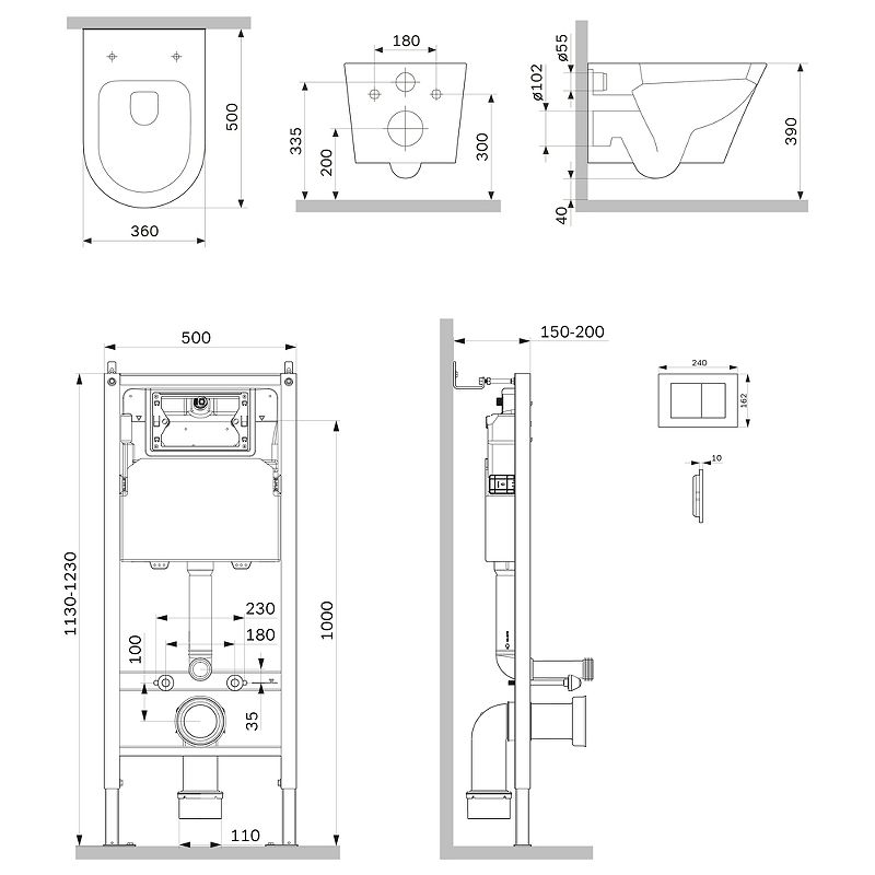 Комплект унитаза с инсталляцией AM.PM Sense FlashClean IS90238.741701 с сиденьем Микролифт и Черной матовой клавишей смыва