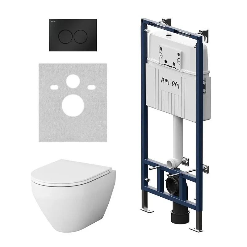 Комплект унитаза с инсталляцией AM.PM Spirit V2.0 IS100138.701700 сиденье микролифтПолностью готовый к установке комплект: система инсталляции с клавишей подвесной унитаз с сиденьем включающий все необходимые крепления патрубки звукоизолирующую прокладку. Экономия пространства благодаря узкому бачку – 120 мм глубиной. Заливной клапан с низким уровнем шума - Класс II согласно европейского стандарта EN 14124. Функция SetUp : Гибкая система крепежа – универсальность и эффективность установочного процесса. Гибко обходит вертикальные и горизонтальные трубы. Высокая прочность и износостойкость. Выдерживает нагрузку до 400 кг. Подходит для унитазов любых размеров. Армированный шланг подачи воды двойная прокладка слива и подачи воды. В комплекте механическая двухрежимная клавиша из ABS пластика в цвете черный матовый. Подключение воды сзади сверху. Выверенный геометрический дизайн унитаза Spirit V2.0 - идеально ровные поверхности с четкими гранями - отмечен премиями iF Design и Good Design. FlashClean - новое поколение безободковых унитазов без использования пластика: 100% гигиеничности 0% брызг. Компактное дизайнерское решение: идеально впишется в санузел любого размера благодаря проекции 49 см. Полностью скрытые крепления и скрытый фановый выход обеспечат эстетическую чистоту дизайна и лёгкость в уходе за керамикой. В комплекте быстросъемное сиденье из дюропласта с механизмом плавного закрывания. Материал сиденья дюропласт устойчивый к появлению царапин в сочетании с креплениями из нержавеющей гарантируют долговечность сиденья. Механизм плавного опускания рассчитанный на 100 000 закрываний и быстрого снятия - комфорт в использовании и легкость в уходе за сиденьем и керамикой.