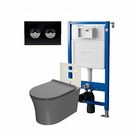Сет: Система инсталляции пневматическая Point Элемент П для подвесного унитаза PN45121 + Клавиша смыва для пневматической инсталляции Point Венера, установка в стену, черный/хром, PN44071BC + Унитаз подвесной Point Вега безободковый, сер мат, PN41711GM