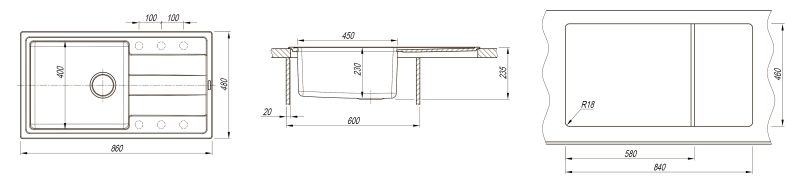 Чаша выполнена из нержавеющей стали марки AISI 304, толщина металла 1 мм., материал столешницы искусственный камень (композитный материал).