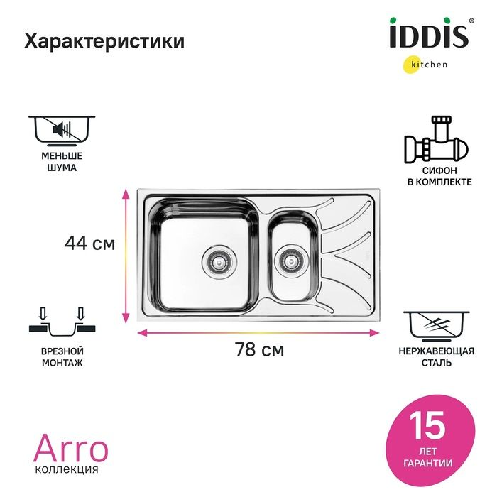 Кухонная мойка IDDIS Arro ARR78S1i77S с сифоном 78см сатин купить