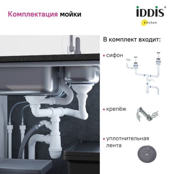 Сифон с отдельным отводом для стиральной/посудомоечной машины с обратным клапаном и гофрированными отводами для удобства подключения. Гарантия на стальные мойки IDDIS® – 15 лет, на сифон – 2 года, на крепления – 1 год.