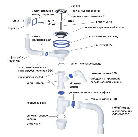 Есть все для монтажа: выпуск, сифон, уплотнительная лента, крепеж.