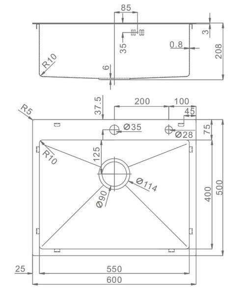 Толщина стали: верх - 3 мм / чаша - 0.8 мм, дополнительное отверстие для установки дозатора