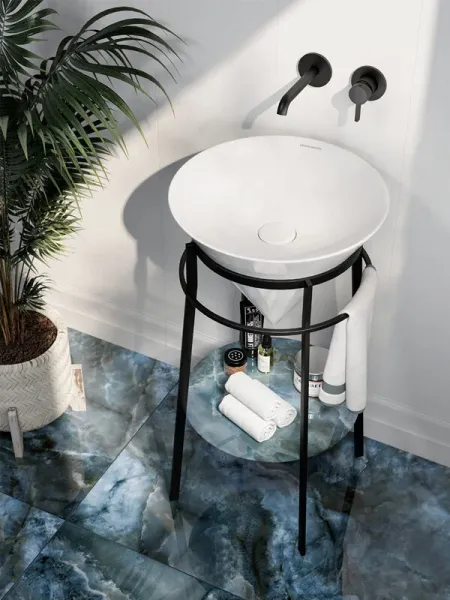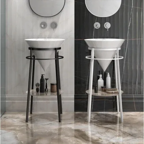 Металлическая структура матовая черная для раковин с бортиком. По периметру расположен большой держатель для полотенца, а ниже предусмотрена установка круглой полки из керамического гранита (3 варианта цвета) или санкерамики (2 варианта цвета) Изделия из ДСП, МДФ, а также изделия из металла требуют правильного ухода и эксплуатации. При установке и дальнейшей эксплуатации изделий, следует обратить внимание на их расположение в ванной комнате: они должны быть установлены вдали от источников тепла; температура воздуха в помещении должна быть в пределах +2 — +25 °С, а влажность воздуха не должна превышать 45%-70%. Во избежание появления пятен, отслоения облицовки и коррозии металла, не допускать скопления воды и жидкостей на поверхностях изделий и как можно скорее протереть сухой мягкой тканью участок, контактирующий с жидкостью. Соблюдайте правила ухода за изделиями из металла и они прослужат Вам очень долго.
