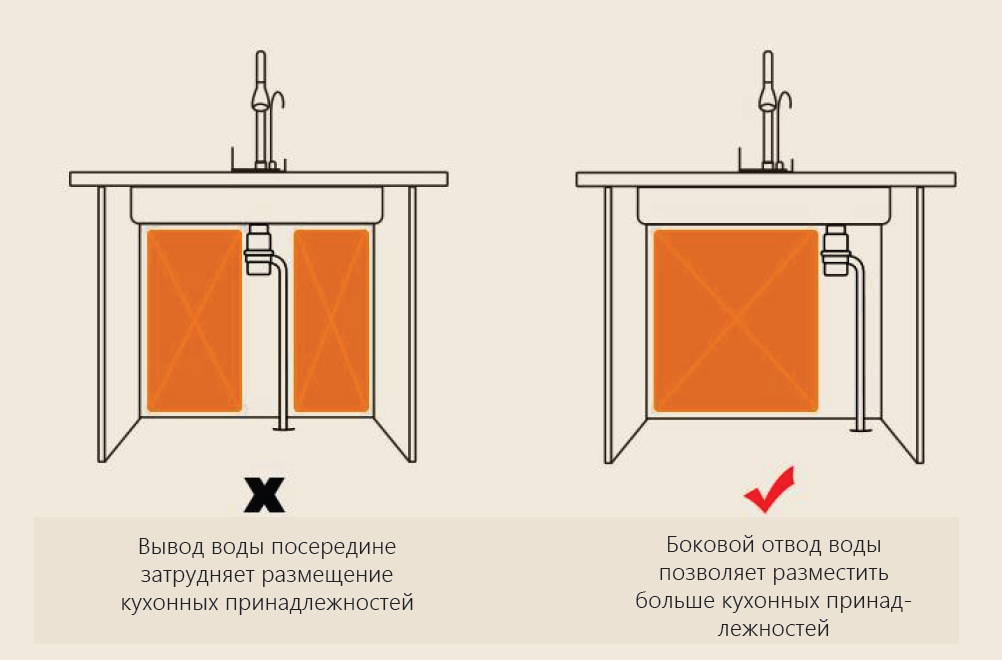 - боковой отвод воды позволяет разместить больше кухонных принадлежностей