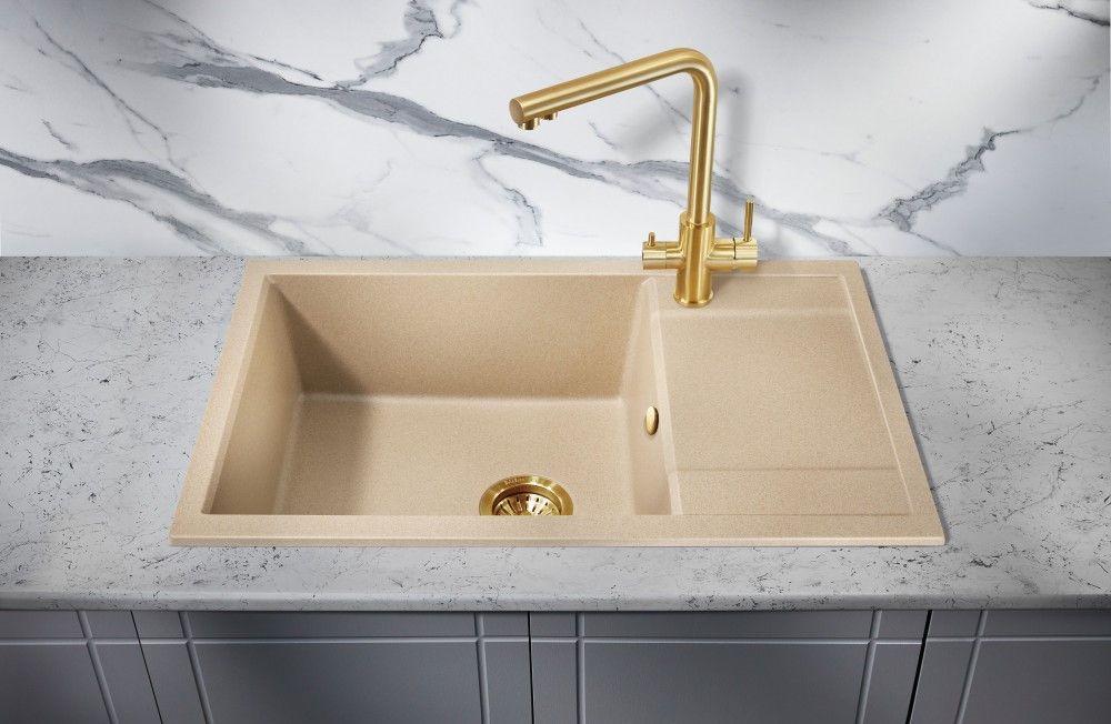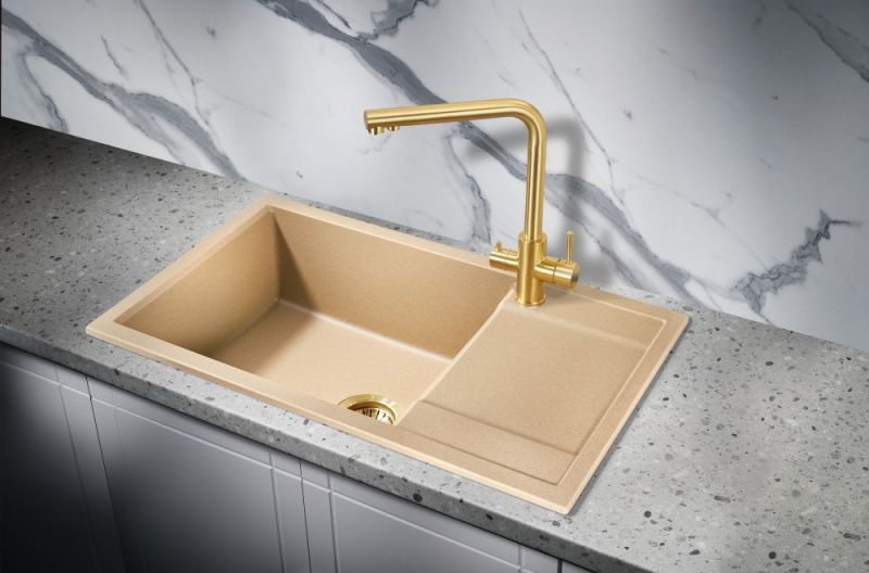 Большая врезная прямоугольная мойка для кухни из искусственного камня MILACIO Navarra 78 Cuarzo (MC.77054) в бежевом матовом цвете — лучшее решение, выполняющее как эстетические, так и практические функции.