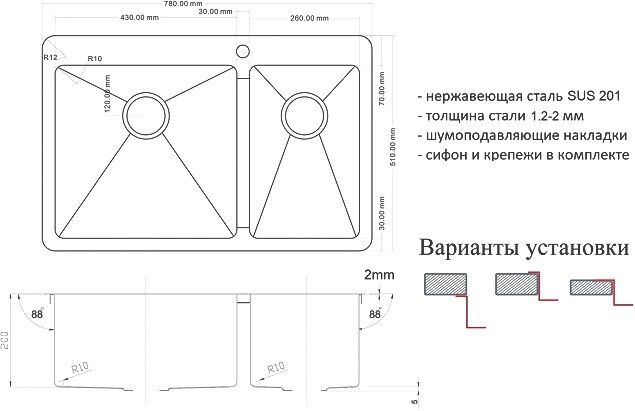 Мойка кухонная Zorg Light GRAFIT ZL R 780-2-510-L GRAFIT