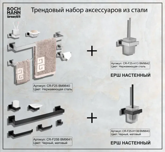 Ванная комната является одним из любимых и часто посещаемых мест человека. Мы проводим там больше 14 тысяч часов за всю жизнь, поэтому она обязательно должна быть не только уютной, но и эргономичной. Ни одна ванная комната не может обойтись без аксессуаров - незаметных на первый взгляд, но совершенно необходимых вещей, которые делают жизнь нашу намного комфортней. Они не только практичны, но и создают общую атмосферу ванной комнаты, придают ей индивидуальность и шарм.Дизайнерские аксессуары BOCH MANN стилистически завершают образ ванной комнаты, создавая целостную и продуманную концепцию. Их функциональный дизайн позволяет дополнить практически любой интерьер, а широкий ассортимент предоставляет свободу выбора. Так как срок службы аксессуаров для ванных и туалетных комнат напрямую зависит от материала, из которого они изготовлены, в производстве аксессуаров BOCH MANN используются только материалы самого высокого качества – нержавеющая сталь и закалённое стекло. Изделия из нержавеющей стали — рекордсмены по сроку службы, сохранению отличного внешнего вида и высоких эксплуатационных характеристик. Надежность конструкций аксессуаров BOCH MANN, профессиональное крепление и прочность покрытия позволяют использовать изделия не только в домашних условиях, но также и в общественных местах, включая отели и рестораны. Безупречность исполнения каждой детали, точность даже в мелочах — это признаки истинной элитарности бренда BOCH MANN.Многие дизайнеры советуют не приобретать аксессуары по отдельности, а отдавать предпочтения уже готовым наборам. Все потому, что при отдельной покупке вы потратите больше денег и можете купить не подходящие друг к другу по дизайну и внешним характеристикам предметы. Выбирая уже готовый набор, вы способны выдержать единую стилистику вашей ванной комнаты. Набор аксессуаров для ванной является не только практичным решением, но и прекрасным элементом декора, с которым ваша ванная комната станет местом, где вы сможете расслабиться, насладиться уютом и эстетикой. Наборы аксессуаров Bochmann для ванной не только помогут сделать вашу ванную максимально комфортной и функциональной, но и станут элегантным дополнением к интерьеру. Преимущества:- эстетический внешний вид;- высококачественные материалы – нержавеющая сталь и закаленное стекло;- тип крепления – скрытый, отличающийся повышенной надёжностью;- два варианта цветов – классический черный и универсальный хром;- чёткие формы каждой детали;- качество, проверенное годами. Состав набора: