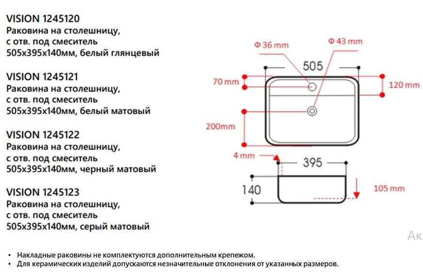 Накладная раковина Avimano Vision 1245120 50см белый глянец купить