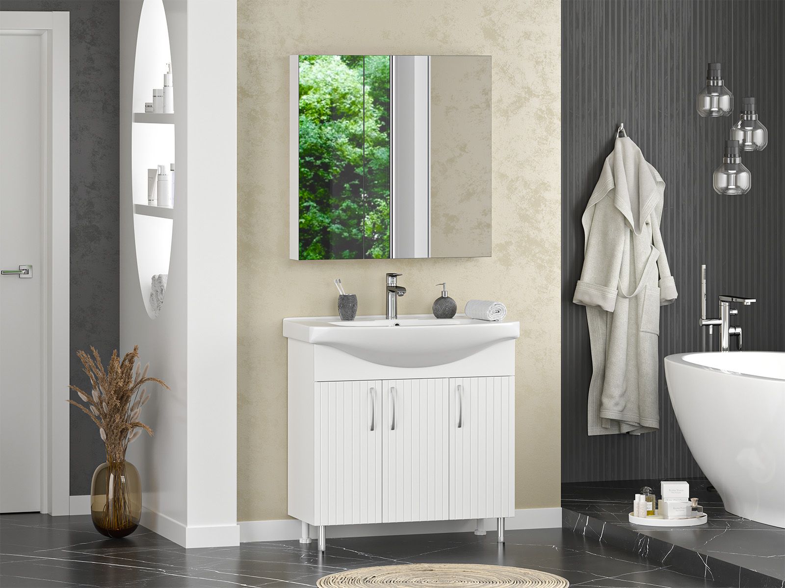 Напольная тумба под раковину – это не просто элемент мебели, но настоящее произведение искусства, которое сочетает в себе функциональность и изысканный дизайн. Изготовленная из высококачественных материалов, она гарантирует долговечность и устойчивость к воздействию влаги.Удобная система хранения позволяет размещать все необходимое для гигиенических процедур, а её продуманные размеры отлично вписываются даже в небольшие помещения. Стильные ручки и элегантные фасады придают тумбе особый шарм, а разнообразие цветовых решений позволит выбрать модель, соответствующую любому интерьеру – от классического до модерн.Мягкие линии и непринужденные формы делают тумбу неотъемлемой частью ванной, превращая её в любимое место для отдыха. Совершенное сочетание эстетики и практичности позволяет создать гармоничный и стильный интерьер, что делает напольную тумбу для ванной комнаты идеальным аксессуаром для любого дома.