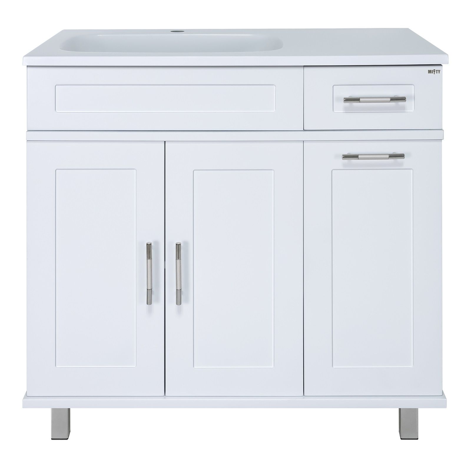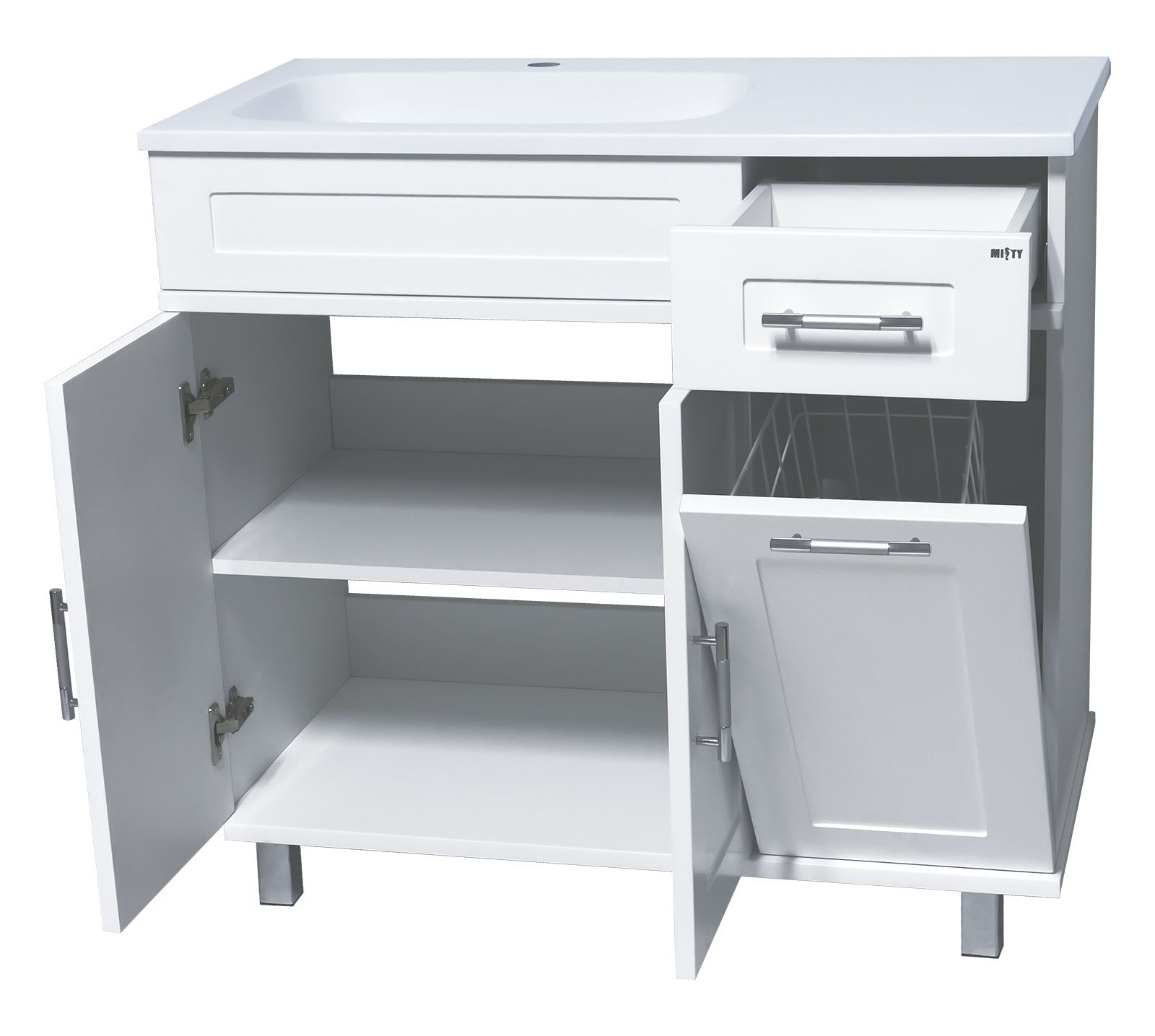 Напольная тумба под раковину Misty Купер 90см левая с бельевой корзиной белый купить