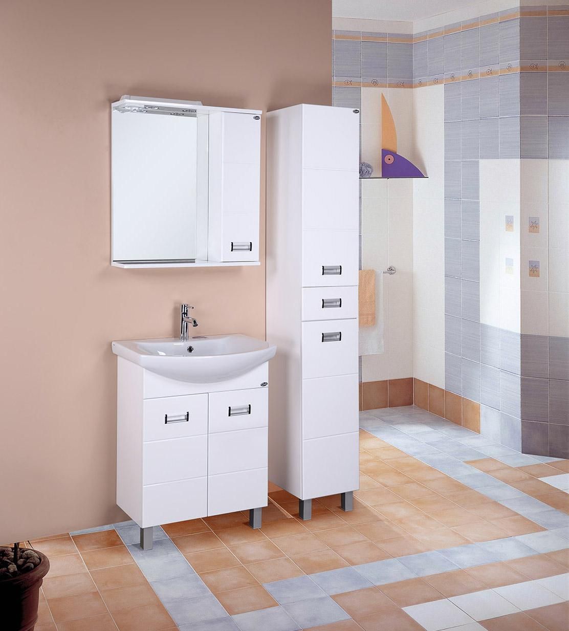 Глянцевый белый цвет фасада, ненавязчивая горизонтальная фрезеровка, врезные хромированные ручки и аккуратная лаконичность - все это позволяет коллекции Балтика стать центральным звеном интерьера ванной комнаты.