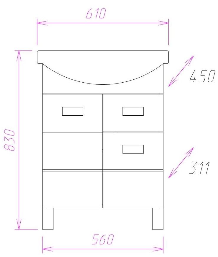Размеры тумбы без учета раковины и ножек: 56x31x68 см.