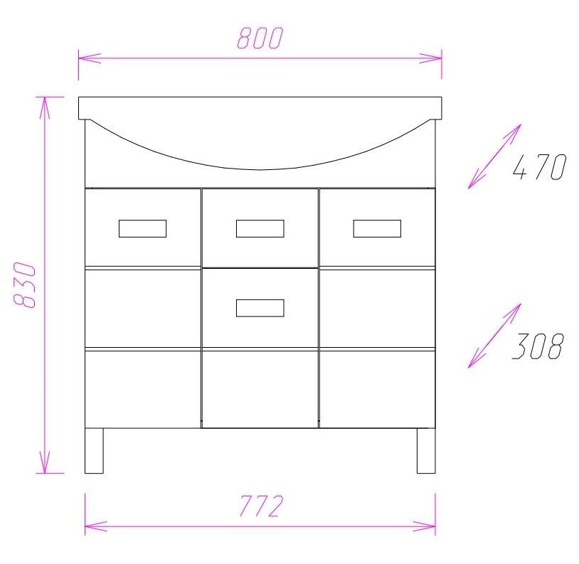 Размеры тумбы без учета раковины и ножек: 77x31x68 см.