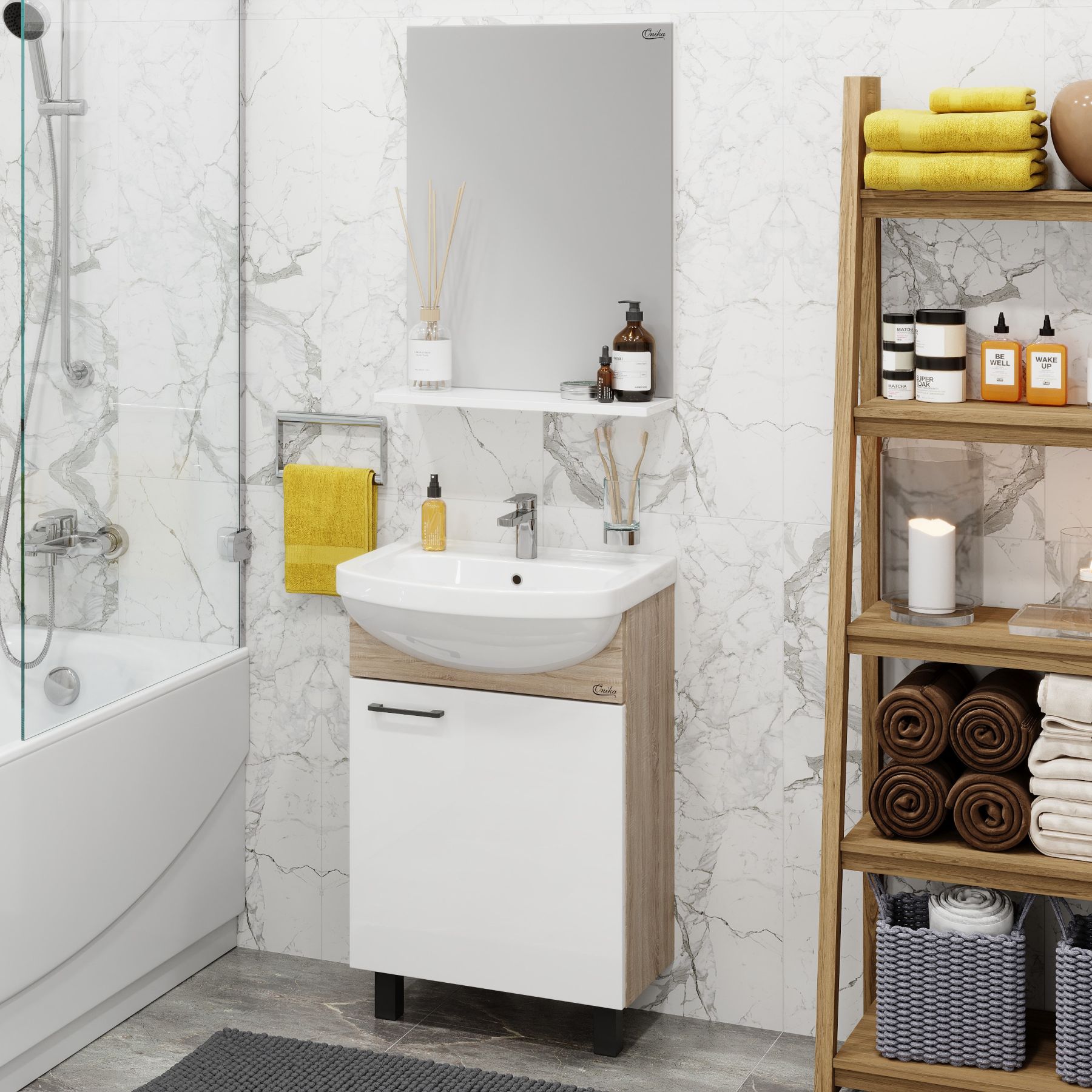 Компактные габариты позволяют грамотно организовать небольшой санузел, а белый фасад и корпус цвета дуба гармонично сочетаются с черной фурнитурой и отлично впишутся в интерьер любой ванной комнаты.