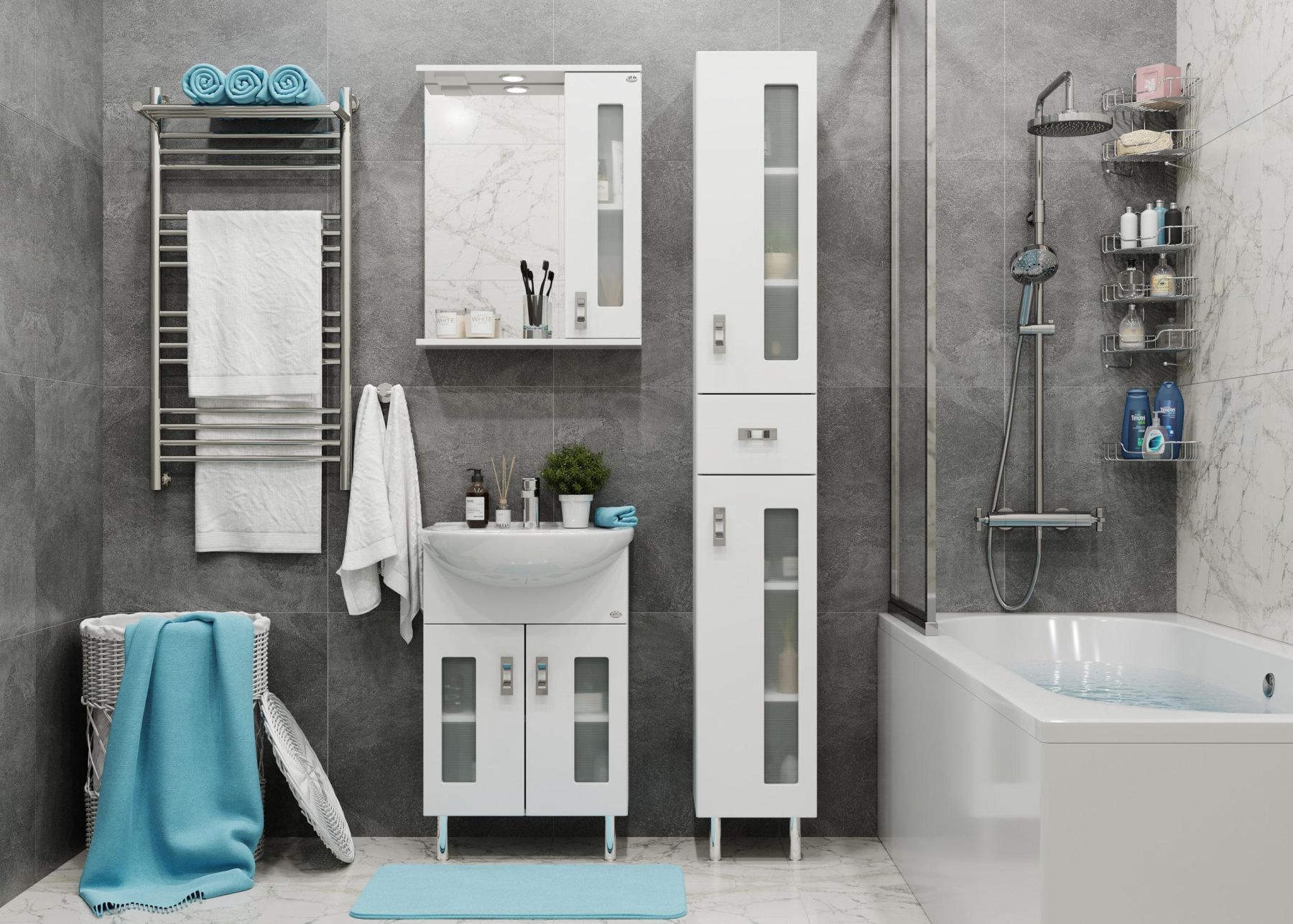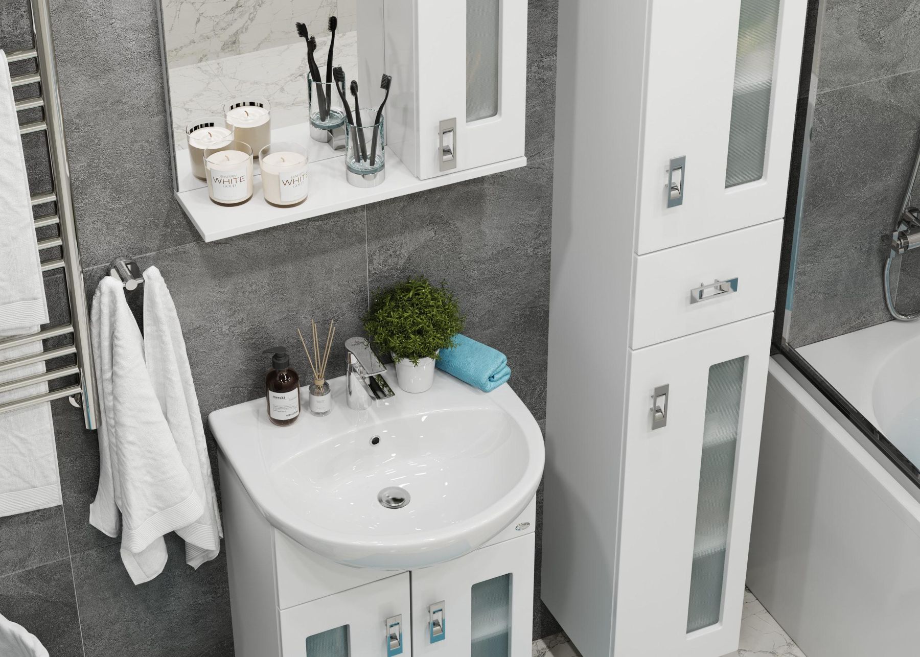 Белоснежный глянцевый цвет фасада в сочетании со вставками из матового стекла и хромированными ручками необычной формы придадут ванной комнате ощущение свежести, чистоты и уюта.
